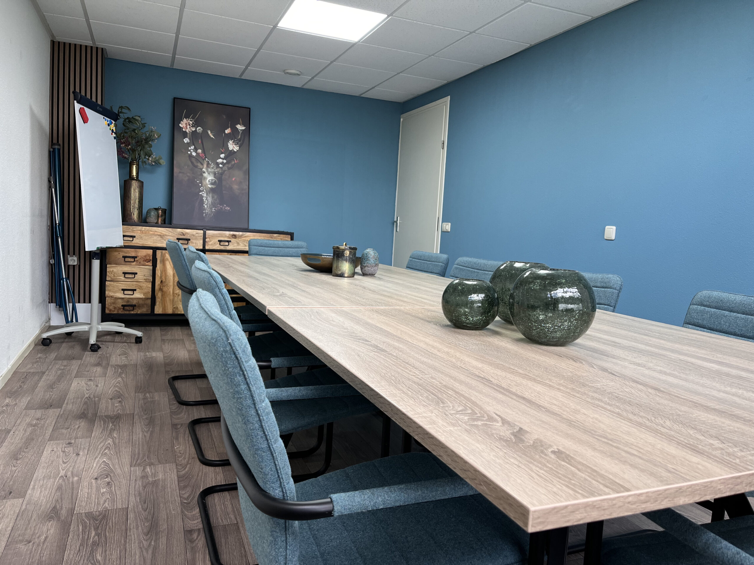 De vergaderruimte biedt ruimte aan 10 personen en is voorzien van een whiteboard en beamer.